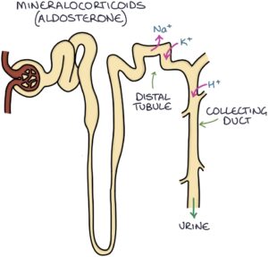 Mineralocorticoids (e.g., aldosterone) help regulate the balance of electrolytes and blood pressure. They act on the nephrons in the kidneys to: