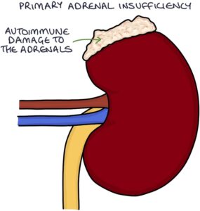 Addison’s disease refers specifically to when the adrenal glands have been damaged, resulting in reduced cortisol and aldosterone secretion. This is called primary adrenal insufficiency. The most common cause is autoimmune.
