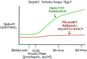 The test involves giving a dose of Synacthen, which is synthetic ACTH. The blood cortisol is checked before and 30 and 60 minutes after the dose. The synthetic ACTH will stimulate healthy adrenal glands to produce cortisol. The cortisol level should at least double. A failure of cortisol to double indicates either: