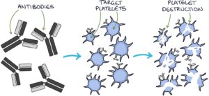 ITP is a condition where antibodies are created against platelets. An immune response against platelets leads to their destruction and a low platelet count (thrombocytopenia).